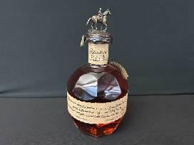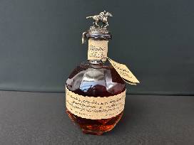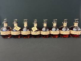 This is a FULL SET of 8 bottles of Blanton's Original Single Barrel Bourbon. Each bottle of Blanton's has one of 8 different stoppers, each depicting a horse and jockey at a different stage of finishing a race. The designs are all lettered so that a complete set laid out side by side will spell, "BLANTONS".