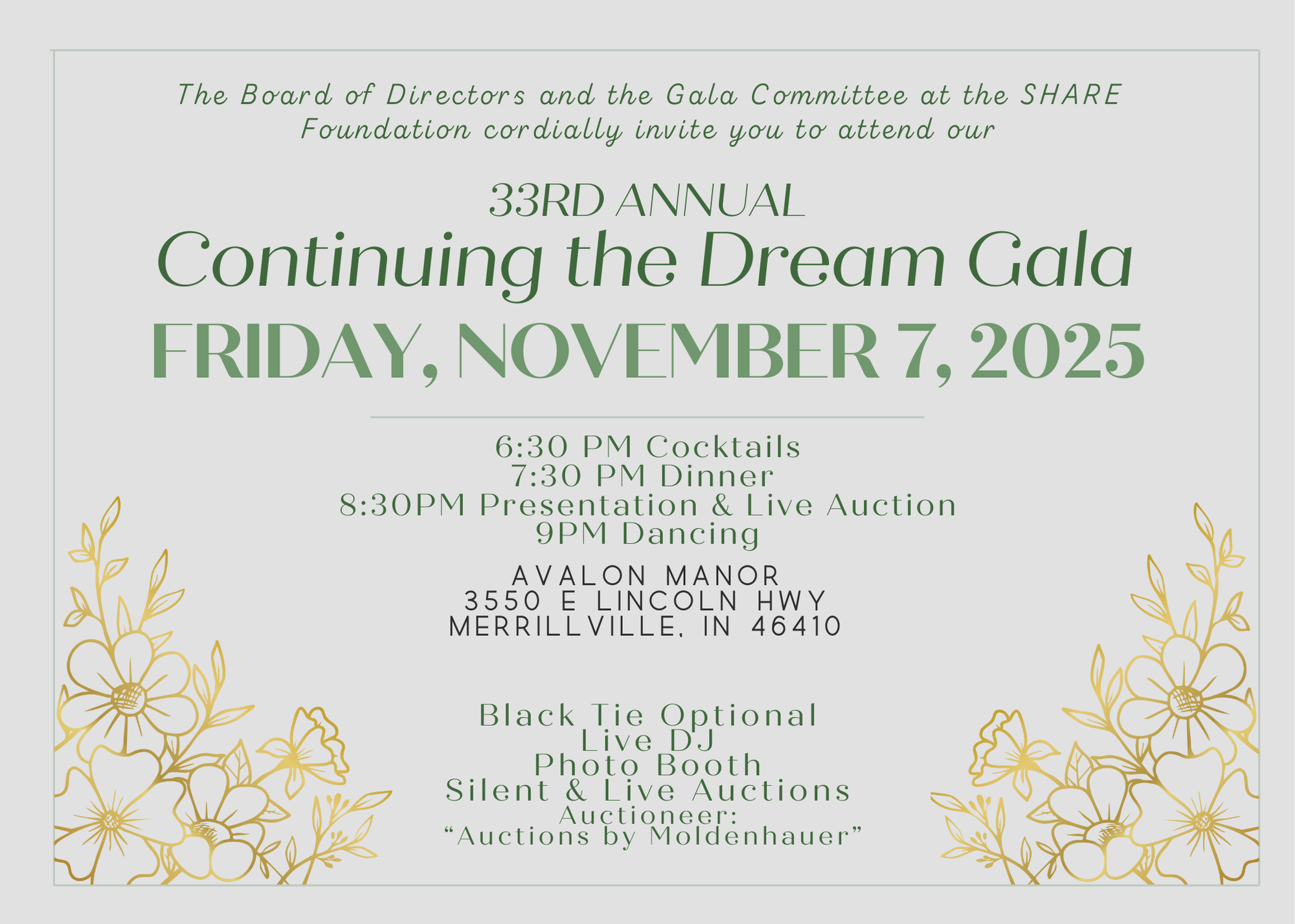 Enjoy an enchanting evening featuring handcrafted cocktails, a delicious dinner, lively dancing, and the excitement of both Silent and Live Auctions. Don't miss the Wine Pull and our inspiring program highlighting the impact of SHARE Foundation.
