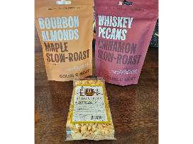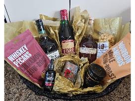 This Matty's Spirit Society Basket contains the following items: *Bottle of Old Forester 100 proof Rye *Bottle of Traveller 90 proof Whiskey *Bottle of Old Forester Smoked Cinnamon Bitters *Bottle of Sweet Vermouth *Jar of Cherries *Double Neat Whiskey-flavored Pecans, Almonds, and Popcorn