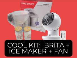 This DSHA stay cool package includes a Brita water filtration pitcher for crisp, clean water anytime, a Frigidaire 26 lb. Portable Countertop Ice Maker in stainless steel to keep the cubes coming, two DSHA glass can cups complete with lids and straws, perfect for iced coffee, infused water, or your favorite sparkling drink and a remote control Woozoo fan to keep you cool!