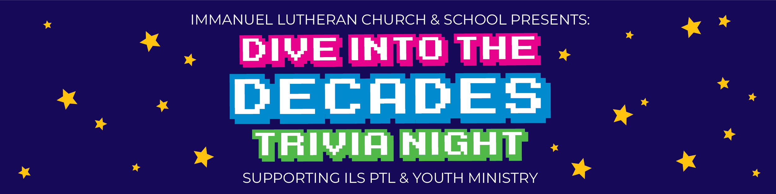 You can still participate in the auction!Get ready for a Dive into the Decades! The 2025 Trivia Night, presented by Immanuel PTL & Youth Ministries promises an unforgettable evening of fun, fellowship giving back, and testing your trivia knowledge! Guests have 10 rounds of trivia, a silent auction, and small live auction to look forward to, as well as your traditional trivia night games everyone loves! Your generosity will help shine a light on our amazing community- supporting family fellowship events, empowering our teachers, and funding Youth Group Activities. Gather up your group of 8 and plan out an awesome table theme of your favorite decade! We can't wait to see you at Trivia Night! Doors open at 6:00 PM