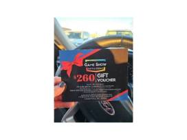 Game Show Battle Room experience for 6!! Comes with trophy, 2 can coozies, 2 beaded necklaces, red & blue foam fingers.
