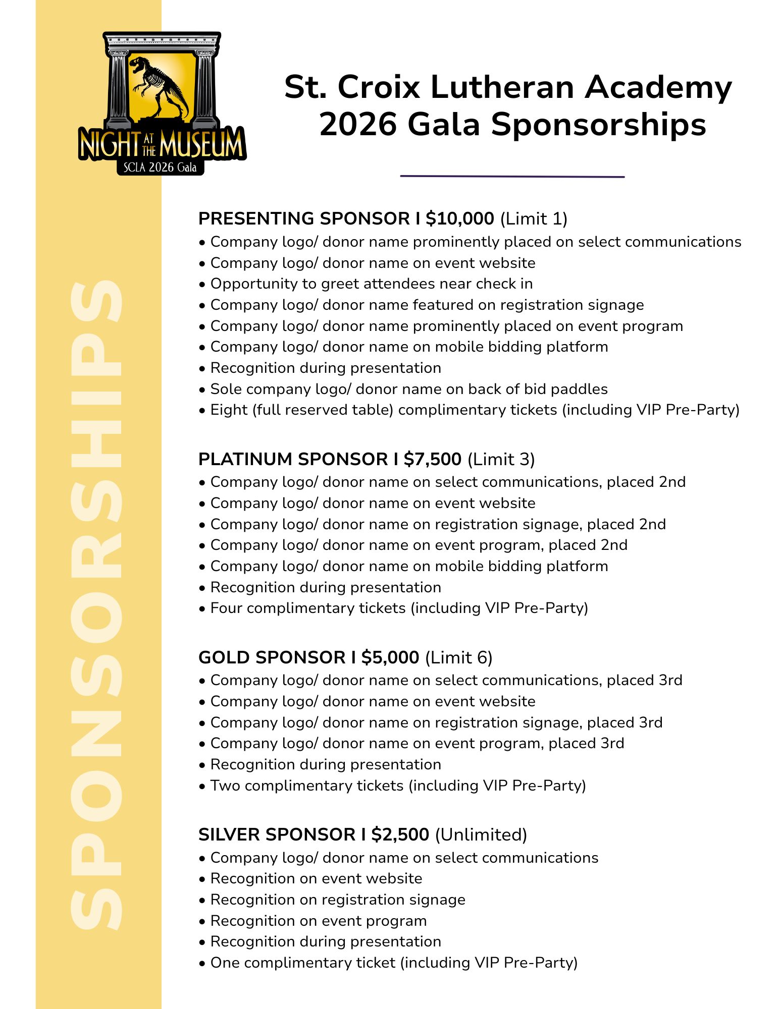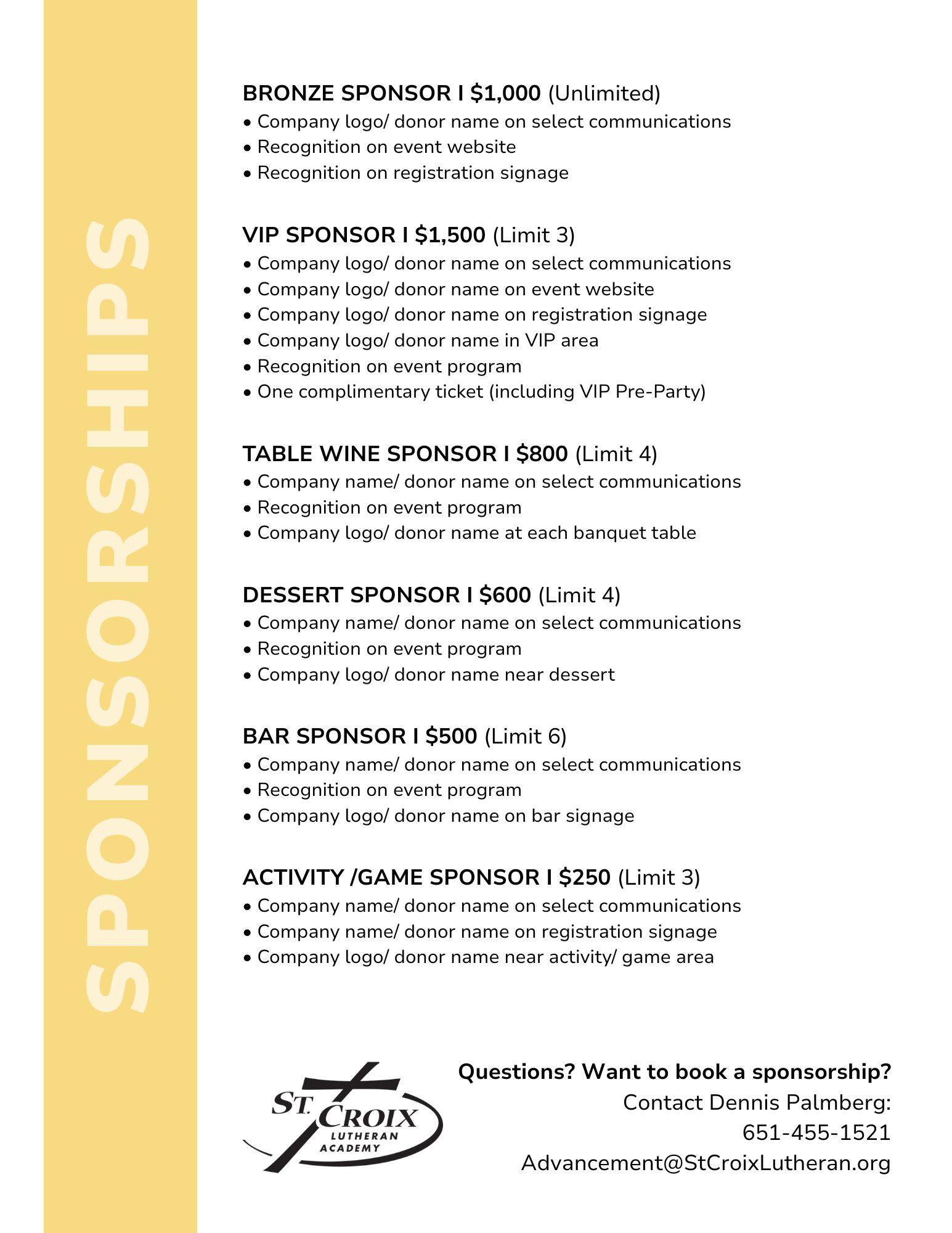 Event sponsors cover necessary expenses for our events, allowing more of the guests' dollars to go directly to SCLA students. For information on sponsorship opportunities, scroll down to the bottom of this page to view opportunities. Please contact Dennis at 651-455-1521 or [email protected] to arrange sponsorships.