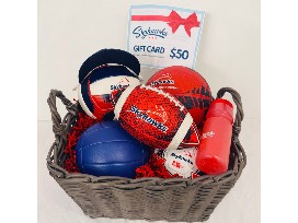 This Skyhawks-themed basket is perfect for sports enthusiasts of all ages. It includes a $50 gift card along with an assortment of Skyhawks balls, a Skyhawks hat, and a branded water bottle. A fun and practical collection for active play, team spirit, and everyday use.