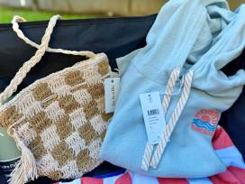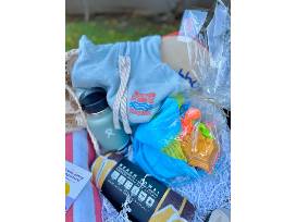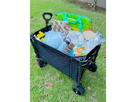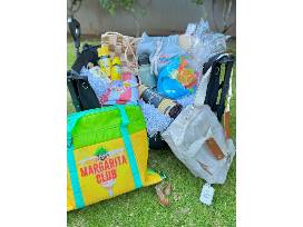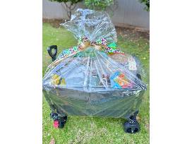 Come hang out at the beach with us! This fun basket has all the parts to make a seaside trip perfect, including a unique wagon with side zip, towels and toys, tote bags, lots of sunscreen and more!