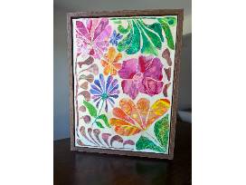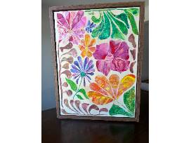 Kindergarten students created colorful drawings using colored pencils, oil pastels, crayons and paint sticks. Their artwork was cut and assembled to form this lively floral design. Every student is represented at least once in the final piece. The artwork is displayed on a 20" x 26" framed canvas and sealed with archival glue to preserve it for years to come.