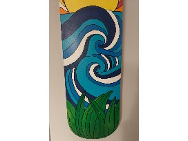 Students collaborated to paint vibrant sunset skies and ocean waves on the back of a Moose 7-ply maple skateboard deck (7.25") using acrylic paint. The board comes with mounting hardware for easy wall display, or it can be converted into a usable skateboard by adding trucks and wheels.