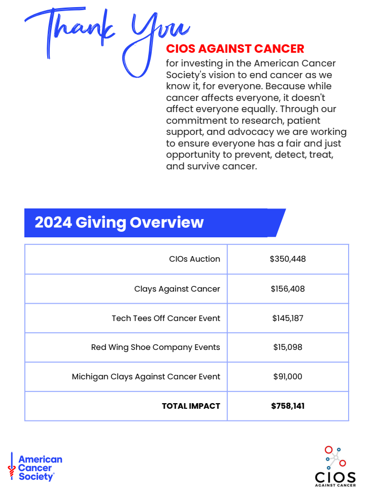 With your support in 2025, the Michigan CIOs Against Cancer team raised nearly $60,000 from the CIOs Virtual Auction Against Cancer. Along with $100,000 raised at the 2025 MI Clays Against Cancer Event in August, we are proud to have funded $160,000 for American Cancer Society research grants last year. Thank you for supporting CIOs Against Cancer!