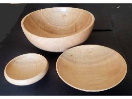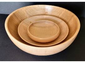 An exquisite trio of maple nesting bowls, masterfully cored and turned from a single 12" x 7" block, showcasing both artistry and precision. This elegant set includes a generously sized 11" x 5" salad bowl, a refined 8" x 2.5" fruit bowl, and a delicate 5" x 2" trinket bowl. Each bowl is carefully finished with a blend of fine waxes and mineral oils, enhancing its luster while preserving its integrity. Meticulously handcrafted by master woodturner Patrick O'Brien, this collection is a timeless expression of craftsmanship and natural elegance. Care instructions are thoughtfully included.
