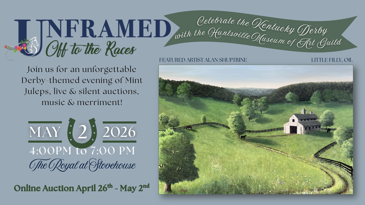 The featured art for UNFRAMED 2026, "Little Filly" was painted and donated to the Huntsville Museum of Art Guild by internationally renowned artist, Alan Shuptrine. www.alanshuptrine.com