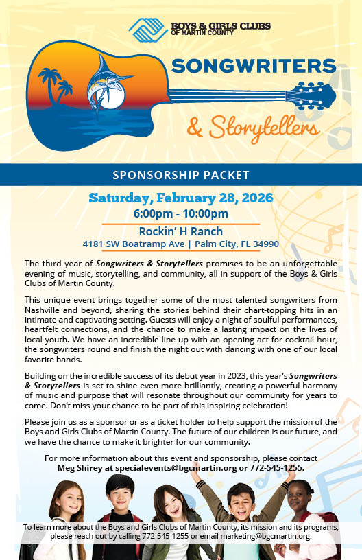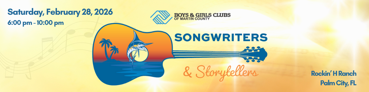 Underwriting the Songwriters & Storytellers event is a powerful opportunity to directly support the mission of the Boys & Girls Clubs of Martin County while aligning your brand with a meaningful, community-driven experience. As an underwriter, you will help make this unforgettable evening of music, storytelling, and community impact possible, allowing us to bring in top songwriting talent from Nashville and beyond and create an inspiring atmosphere for guests. Your support ensures that every dollar raised goes further in providing life-changing programs and resources for local youth. This is more than just supporting an event-it's a philanthropic investment in brighter futures and a meaningful way to uplift and empower the next generation. Join us in making a lasting impact!