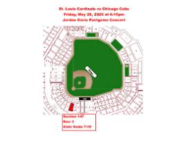 Enjoy a the classic Cardinals vs Cubs rivalry on Friday, May 29, 2026, at 6:15 p.m. Tickets are Section 147, Row 3, Aisle Seats 7-10. Seats are behind home plate just 3 rows behind the green seats. Country star Jordan Davis takes the stage after the game as part of the Postgame Concert Series at Busch Stadium! Concert begins 30 minutes after the game ends. Game and concert are included with the ticket. An overnight stay at Drury Hotels is included.