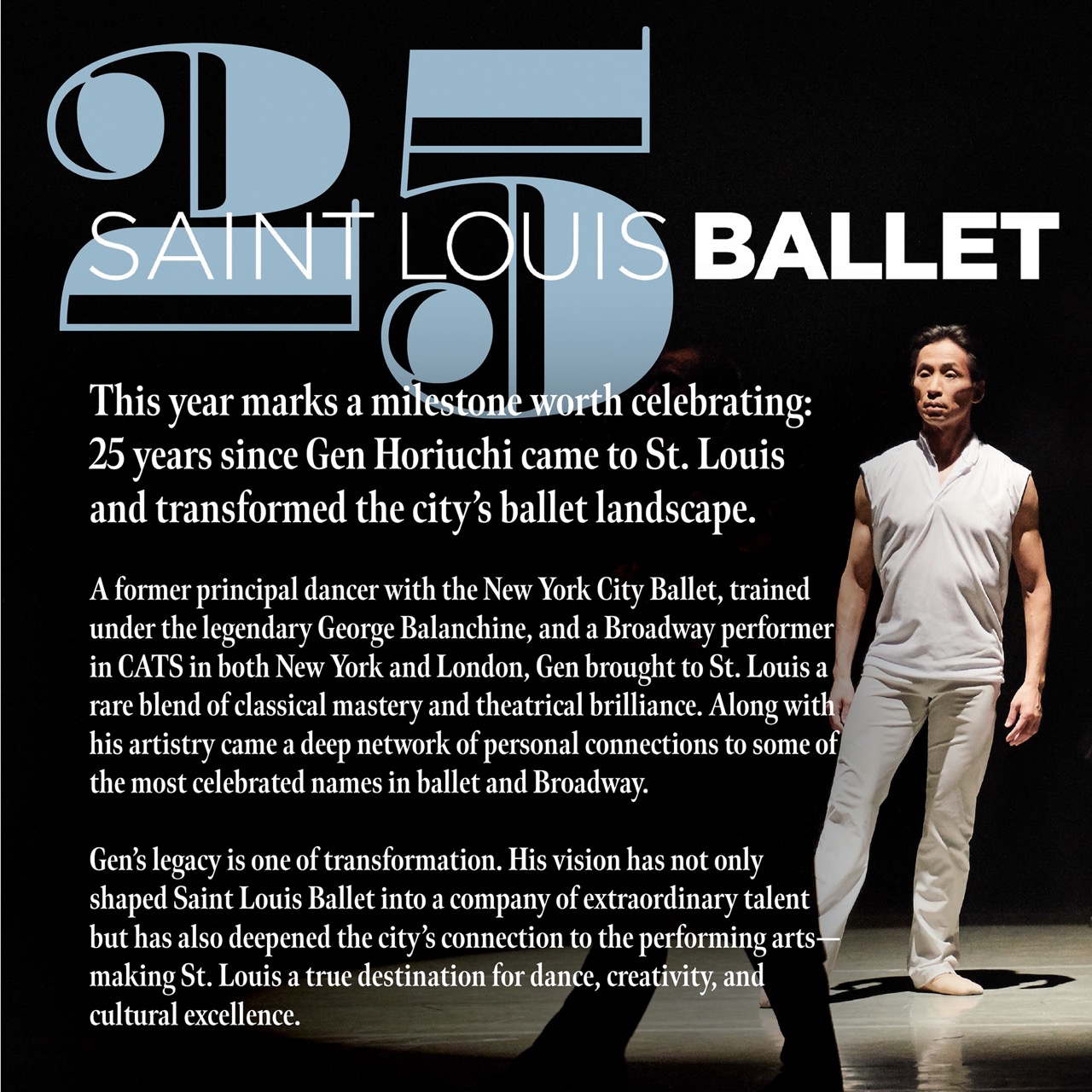 We are honored to serve as Chairs for the 2026 Saint Louis Ballet Winter Gala, a very special evening celebrating Gen Horiuchi's 25th Anniversary as Executive and Artistic Director. This milestone marks a quarter century of extraordinary artistry, growth, and impact-both on stage and throughout the St. Louis community.