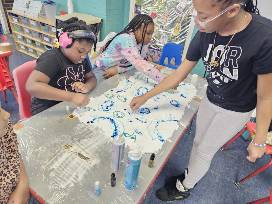 The theme of this season is understanding identity/emotions through artists and their art. We study and practice various art techniques. Students practice emotional regulation, develop confidence, critical thinking, and cognitive growth by exploring ideas, making choices, and communicating feelings visually through the art they create. We used paper marbling for this project. Our materials included: paper, shaving cream, toothpicks, gold leaf, and watercolors. This activity strengthens fine motor skills and visual tracking skills. Using shaving cream makes it a sensory experience that fully engages their whole being. The process encourages a calm meditative state where they are focused, take turns, and experience a sense of accomplishment when they see the results.