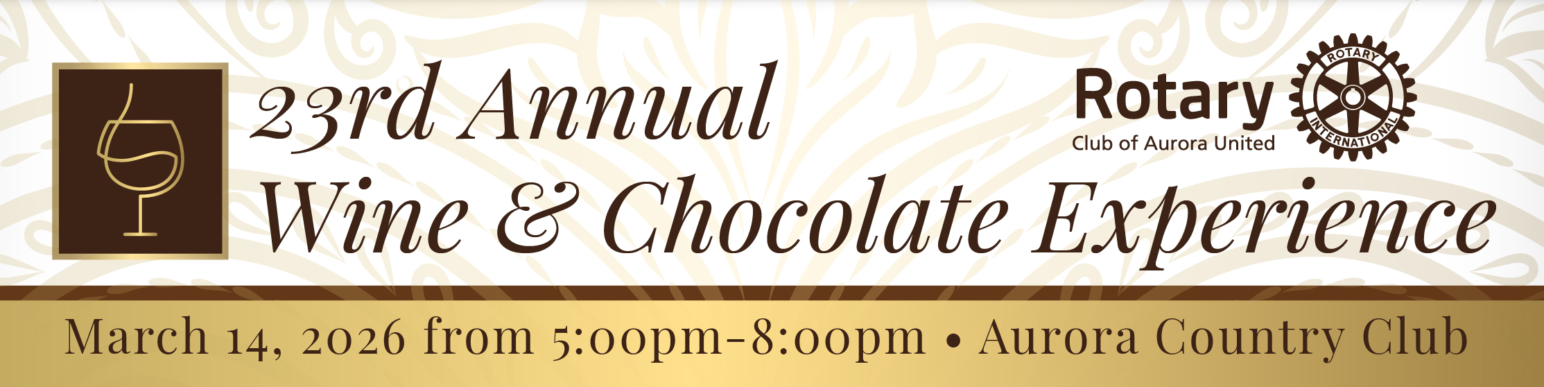 You can still participate in the auction!The Rotary Club of Aurora United invites you to join us for our 23rd Annual Wine & Chocolate Experience at the Aurora Country Club on March14, 2026 from 5:00pm to 8:30pm. All proceeds from this event will benefit programs that support families and strengthen our local community!