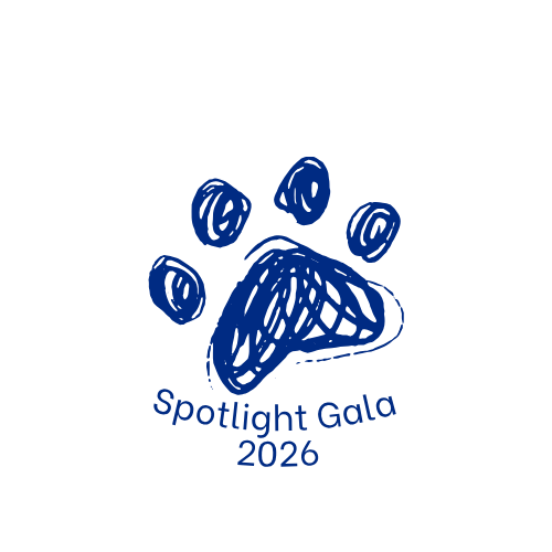 Featuring a sleek, modern silhouette with a rich cobalt-blue base, the glass is adorned with delicate paw prints, stars, and playful animal silhouettes dancing beneath the Spotlight Gala logo, symbolizing the pets whose lives are transformed because of this special night.