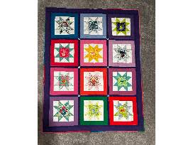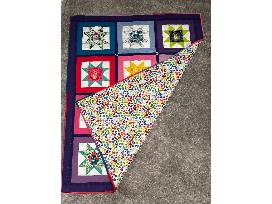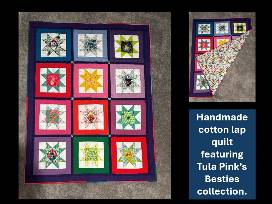 This is a handmade cotton lap quilt featuring Tula Pink's Besties collection. It measures 49 x 64 inches and has a multicolor heart backing and a scrappy border.