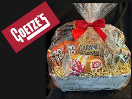 Enjoy a Goetze's basket filled with an assortment of candy. A Goetze's t-shirt & baseball cap.