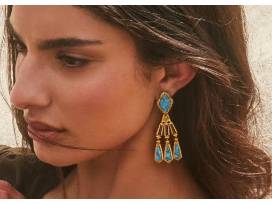 A gorgeous collage of vibrant stones in a blue mix and intricately etched metalwork in gold, the Adeline Gold Statement Earrings are designed to stand out. These three-tiered drop earrings feature a stud inspired by the belling Abbie shape and thoughtfully selected stones that are ready to stun from every angle.