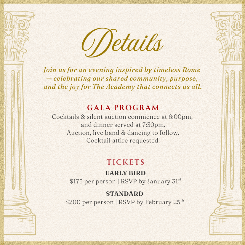 All proceeds directly support The Academy's mission-providing award-winning Blue Ribbon academics, joyful learning, and enriching opportunities for every child to thrive.