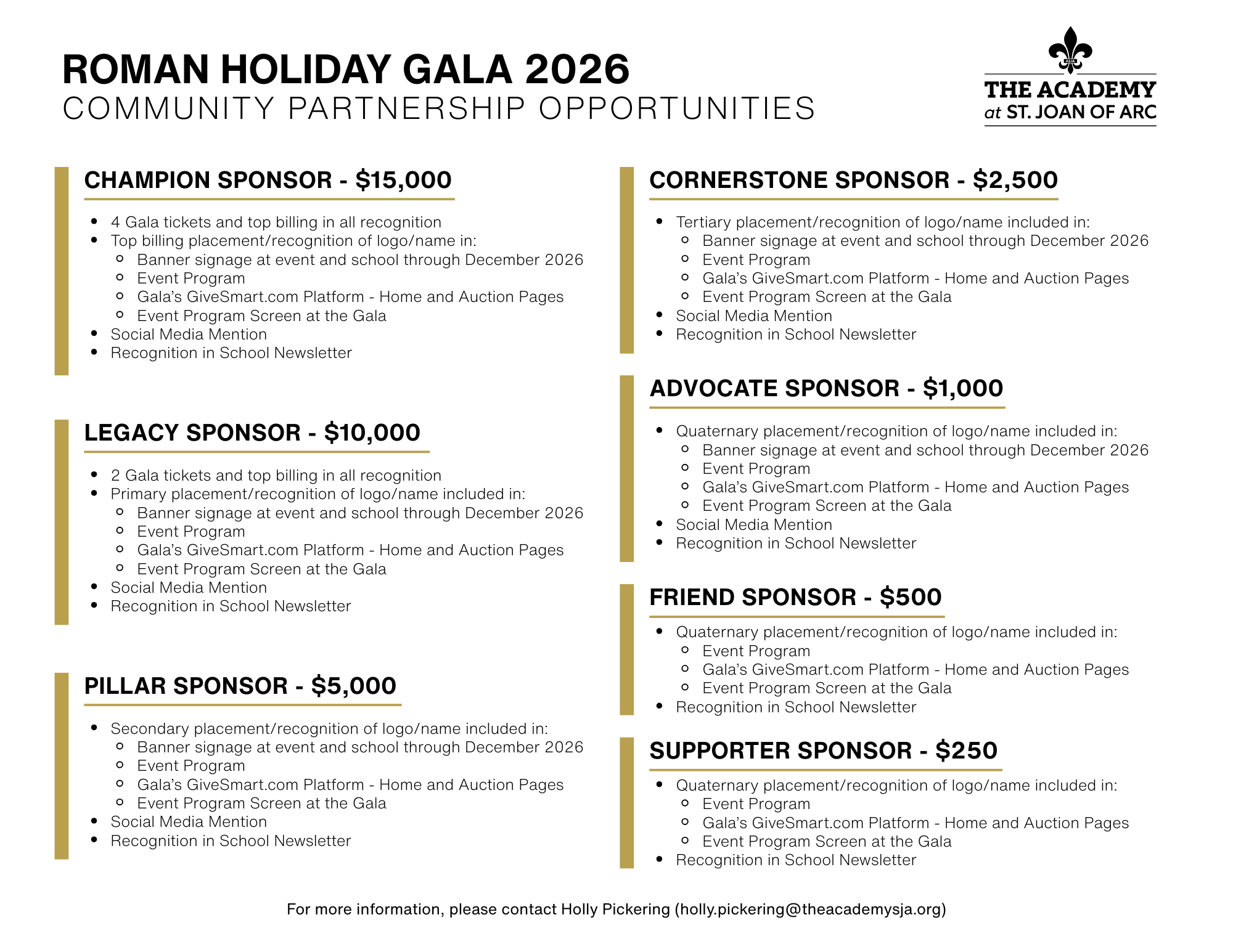 We want to thank the community and corporate sponsors that have so generously made a financial contribution to ensure the success of the Academy at St. Joan of Arc. We are humbled by the outpouring of support towards this event, and this amazing school.
