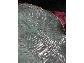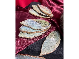 Handcrafted leaf serving plate, medium blue and gray serving dish, seven (7) leaf utensil holders, and two (2) small dip dishes