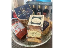 Ranieri set of three (3) 8.4 FL oz flavored extra virgin olive oils, Pastificio pasta, Pastificio taralli caserecci, ceramicheitalia serving bowl, Gourmet Pantry marinara pasta sauce, Amari almond biscotti