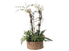 Graceful white Phalaenopsis orchid blooms rise above a lush underplanting of ferns and tropical foliage in this thoughtfully arranged, garden-style basket from Tiger Lily Florist. Airy, textural, and timeless, this design pairs sculptural orchids with verdant greens for a look that feels both polished and organic.