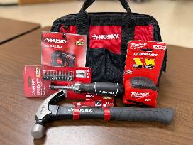 Tool bag with hammer, measuring tape and ratcheting screwdrvier set. $25 gift card to The Home Depot.