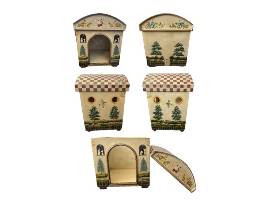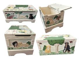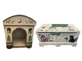 Add a touch of artistry and charm to your home with this beautifully hand-painted wooden doghouse (23" x 28") and matching toy chest (24" x 12").