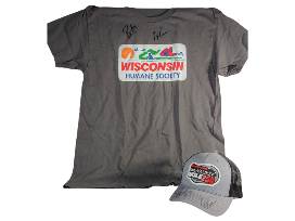 Score this grey Snap-On Milwaukee Mile 250 baseball cap along with a Wisconsin License Plate WHS shirt (size large), both personally signed by IndyCar drivers Pato O'Ward and Myles Rowe. Perfect for racing fans and collectors looking to add some authentic swag to their gear!