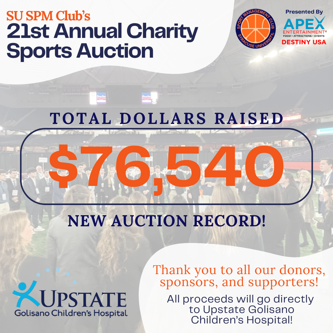 You can still participate in the auction!We are proud to announce the 21st Annual Syracuse University Charity Sports Auction presented by Apex Entertainment Syracuse raised a TOTAL of $76,540 to benefit Upstate Golisano Children's Hospital!