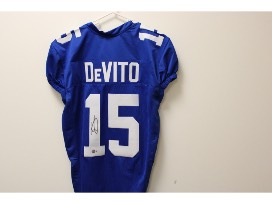 Jersey signed by former NY Giants and current New England Patriots quarterback, Tommy Devito. Devito spent the first five years of his college career at Syracuse where he comiled 3866 passing yards and threw for 28 touchdowns. He finished his collegiate career at Illinois and was signed as an undrafted free agent by the Giants. In 2023, following injuries to Daniel Jones and Tyrod Taylor, he was named the starter and in 6 starts went 3-3. DeVito quickly became a fan favorite and was given the nickname 'Tommy Cutlets" in reference to his Italian heritage.