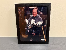 Photo signed by legendary New England Patriots head coach, Bill Belichick. Bill Belichick is one of the most accomplished coaches in NFL history, best known for his legendary tenure with the New England Patriots. As head coach from 2000-2023, he led the franchise to six Super Bowl championships, nine AFC titles, and over 300 career wins, cementing his legacy as one of the greatest football minds of all time.