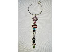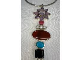 One of a kind statement necklace with semi-precious gem stones and hammered silver collar.