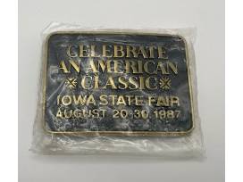 The cast buckle features the 1987 Celebrate an American Classic theme. This one is new in the plastic wrap. Limited edition, 1 of 400.