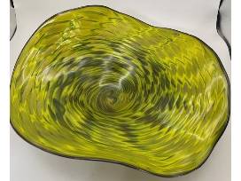 Created by the glass blowers at the 2024 Iowa State Fair, this 5" tall by 12.5" wide glass blow rests on a yellow pedestal and has flowing, fluted sides.