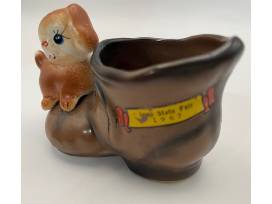Not sure of the story behind this ceramic piece but the sticker imprint says Iowa State Fair 1967. The piece is 3.5" wide x 2.5" tall.