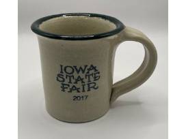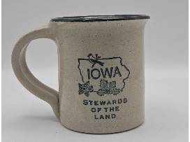 Created by New Harmony Pottery, this 2017 dated mug has accents in dark green. On the reverse is a design for Iowa and Stewards of the Land.