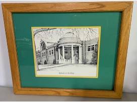 A framed line drawing print of the Agriculture Building by Bill McNarney. The print measures 14" x 11" and the finished framed and matted piece is 21.75" x 18".