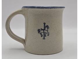 Coffee mug with blue accents created by New Harmony Pottery. A carousel horse is stamped on the reverse side.