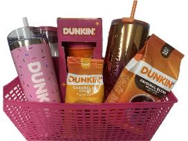 Whether you're brewing at home or taking your coffee on the go, this basket is filled with bright colors, bold flavor, and all the Dunkin' energy you need to rise and shine!