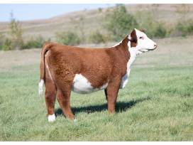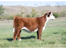 Polled. This is Jan's natural and she's a young blood that is as skinny as it gets but just look at the lines and the balance from the side. She's sired by a Sancho son and I haven't been around a Sancho that didn't have enough body so I'm confident this one will come. Reminds me a lot of Peskey's heifer they gambled on last year at this time and she turned into the most dominant Hereford heifer in SD/MN. I think this one has a chance to do the same.