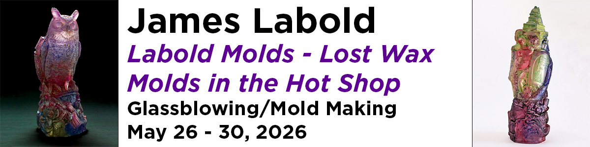 This 5-day hot glass intensive will explore the Hot Blow Mold and Lost Wax processes. This process utilizes aspects of lost wax casting combined with glass blowing to create blown glass forms with highly detailed surfaces with a finish similar to cast glass. Time will be split between sculpting, mold making, and the hot glass studio.