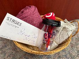 For the young thespian in your life! STAGES St. Louis Performing Arts Academy basket includes $225 gift certificate to be used toward any half-day summer camp, a gift certificate for 2 tickets to a mainstage production, 2 T-shirts, a cozy warm sweatshirt, Crazy for STAGES tumbler, lip balm, and a pen.