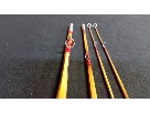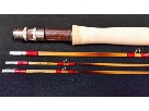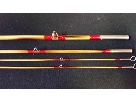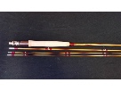 Custom Handcrafted rod is a 3 piece, 2 tip rod w/assembled length of 7' 6" and comes w/a rod sock and aluminum tube. A 3 weight rod. Bamboo has been flamed a tiger striped pattern and heat treated. Ferrules are nickel silver as is the hook-keeper and winding check. Guides are stainless ssteel, Snake Guide brand. Tip tops are matching chrome. Stripper guide is an Agate guide w/a beautiful red stone. All guides are wrapped in Chinese red silk thread and tipped in black silk, then 3 coats of spar urethane finish. Reel seat is polished aluminum w/walnut spacer. Grip a traditional 7" western style made of Flor grade cork. Finshed w/3 coates of spar urethane.
