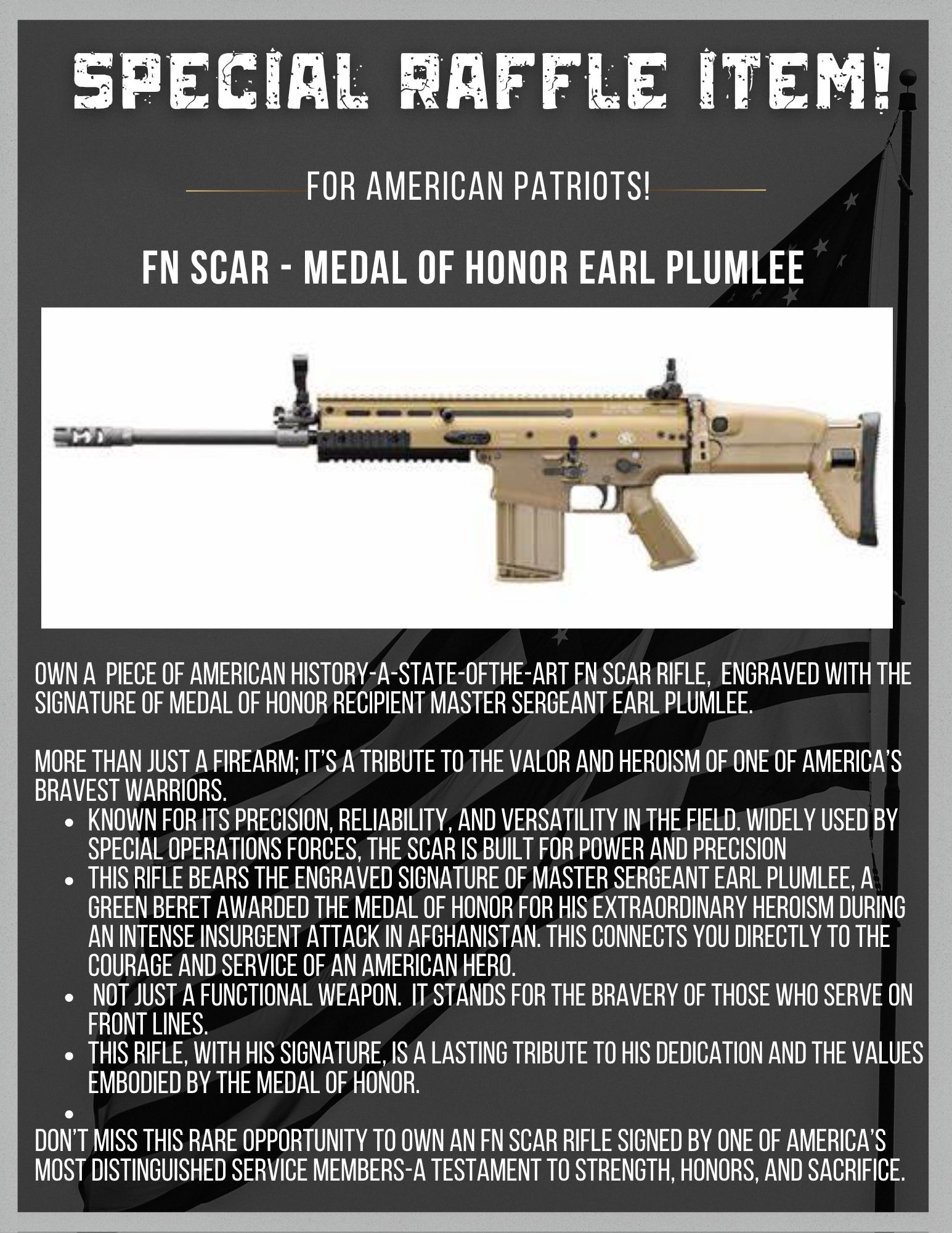 This exclusive opportunity features a limited raffle for a custom FN SCAR rifle engraved with the signature of Medal of Honor recipient Master Sergeant Earl D. Plumlee. Proceeds support programs that help veteran entrepreneurs launch and grow their businesses.