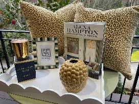 Add timeless sophistication to your home with this curated decor collection. Includes two Ellenburg Chair Co. 24" cut velvet leopard pillows with down inserts in a warm golden velvet fabric, Alexa Hampton: Decorating in Detail coffee table book, white scalloped tray, green and white wood parquet frame and a beehive golden vase.