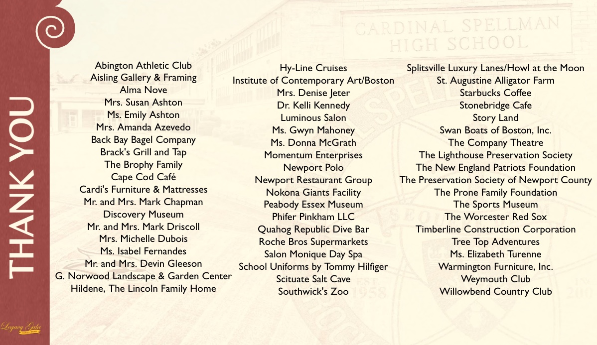 This year's event will be an extraordinary evening celebrating the proud legacy of Cardinal Spellman High School while embracing the nostalgia of our beloved gymnasium.