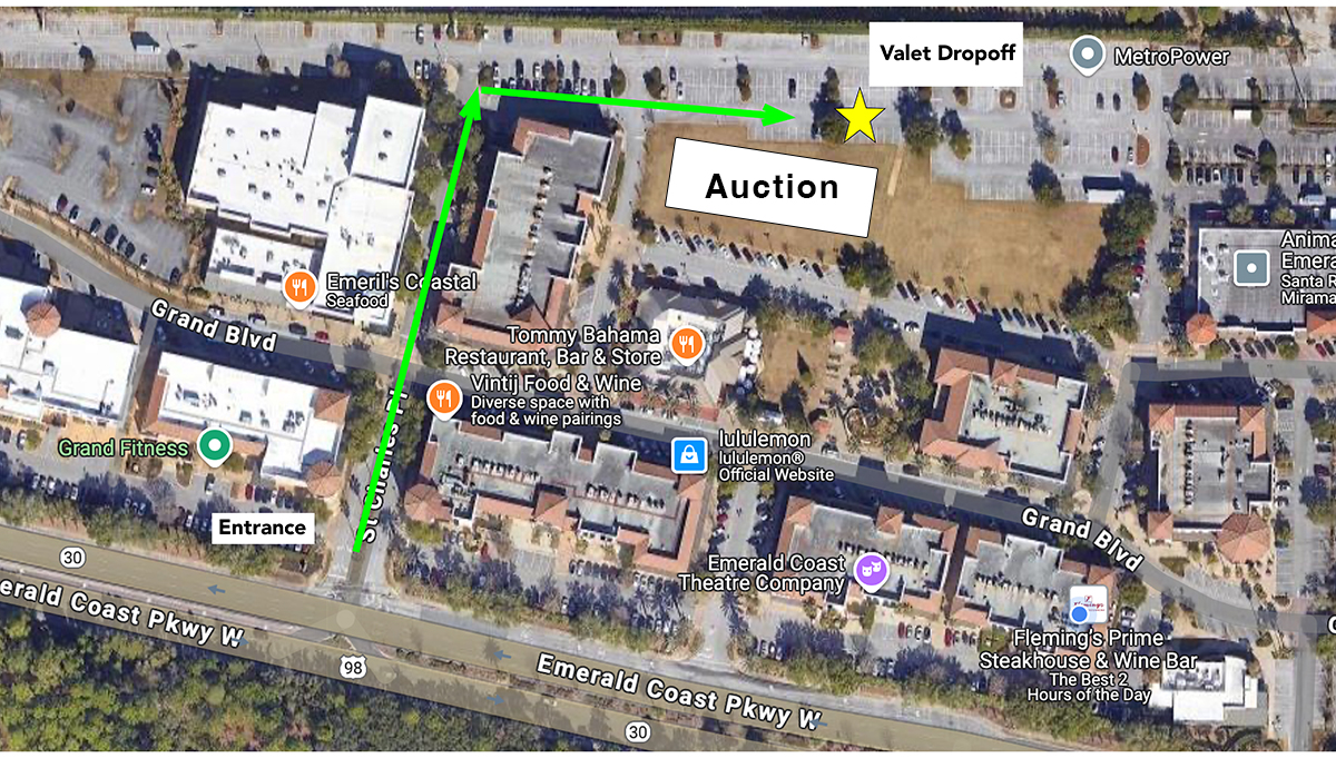 For guests wanting to utilize valet - Enter from Hwy 98 at the turn into Grand Blvd by Vin'tij Food & Wine. Continue North toward the parking lot and take a right beyond Building 495 (Chico's, The Jewel, Spaces, etc.) *Traffic patterns in Grand Boulevard Town Center will be altered to streamline the valet and parking process this year, please follow the directions listed above for convenience.